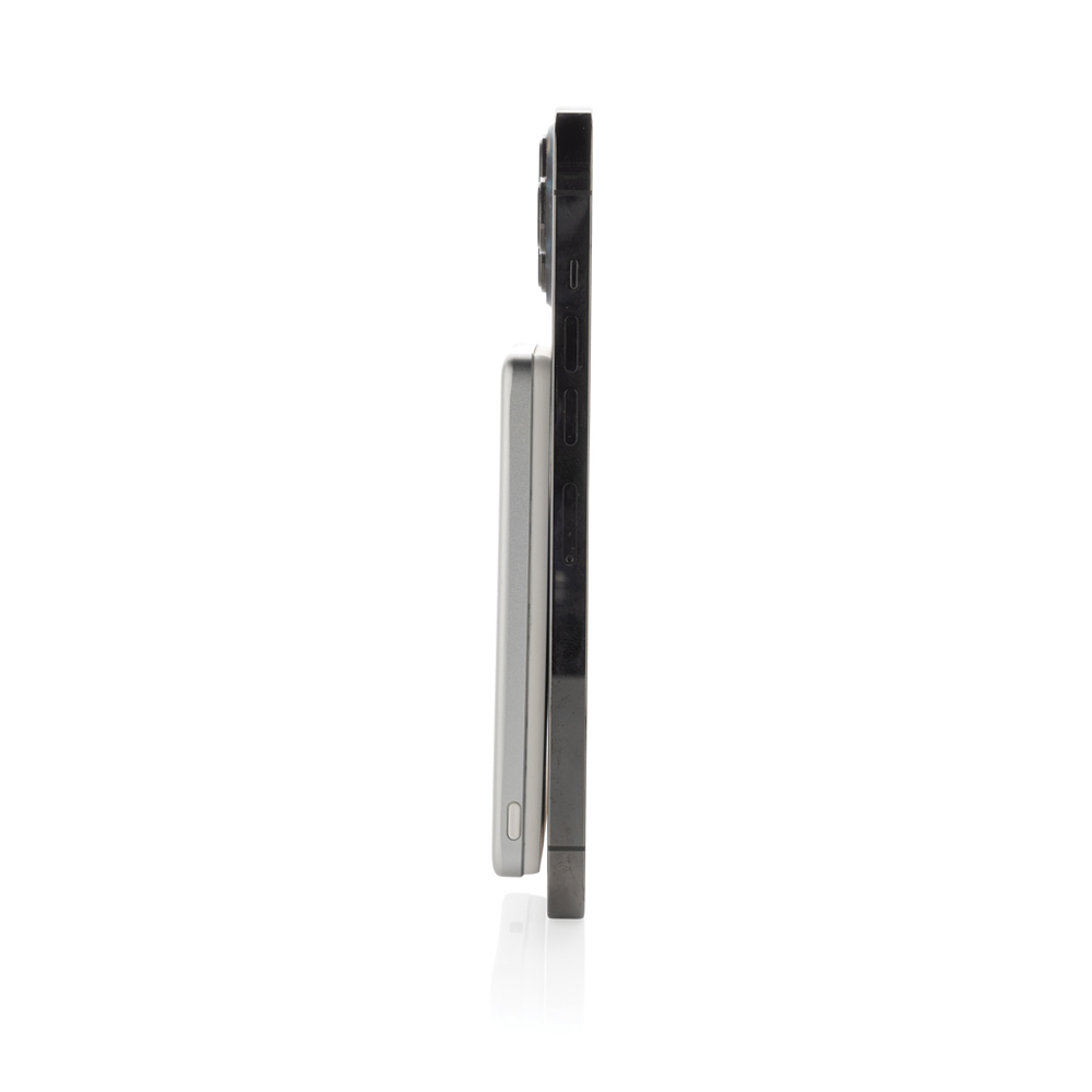 Ultradünne 5.000mAh Powerbank mit magnetischem, kabellosem 5W-Ladegerät, bei der das Gehäuse aus RCS-zertifiziert recyceltem Aluminium und recyceltem ABS-Kunststoff hergestellt ist. RCS (Recycled Claim Standard) ist ein Standard zur Überprüfung des Recyclinganteils eines Produkts über die gesamte Lieferkette hinweg. Recycelter Gesamtanteil: 23%, bezogen auf das Gesamtgewicht des Artikels. Die Powerbank enthält einen langlebigen 5.000mAh-A-Grade Lithium-Polymer-Akku. Die Ladestandsanzeige zeigt den verbleibenden Energiestand an, damit Sie immer wissen, wann Sie wieder aufladen müssen. Type-C-Input: 5V/2,4A; USB-C-Output: 5V/2A.4A. Artikel und Zubehör sind PVC-frei. Inklusive RCS-zertifiziert recyceltem TPE-Ladekabel. Verpackt in FSC®-Mix-Verpackung.