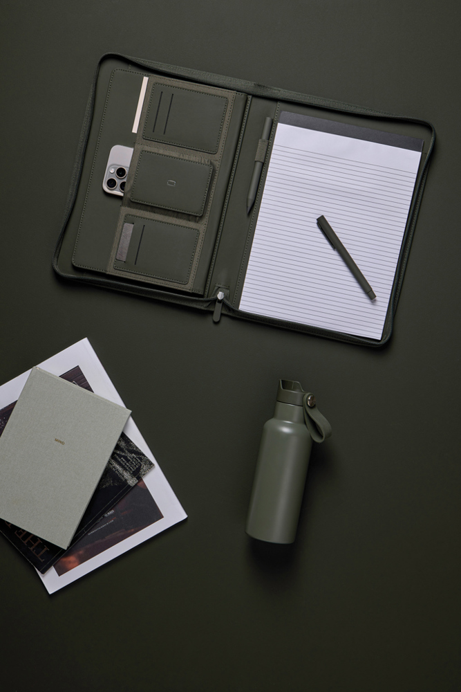 Mit dieser eleganten Mappe im A4-Format behalten Sie den Überblick und haben Ihre wichtigen Dinge immer dabei. Sie verfügt über einen Stifthalter, eine Tasche für Dokumente, elastische Taschen für Karten und Telefon sowie einen Notizblock mit 20 linierten Seiten. Das Portfolio, teilweise aus recyceltem Polyester gefertigt, mit der klassischen matten PU-Beschichtung von Baltimore ist das ideale Accessoire für Ihren Schreibtisch oder für unterwegs. Die RCS-Zertifizierung (Recycled Claim Standard) garantiert, dass die gesamte Lieferkette der recycelten Materialien zertifiziert ist. Der Gesamtanteil an recyceltem Material basiert auf dem Gesamtgewicht des Produkts. Dieses Produkt enthält 6% RCS-zertifiziert recyceltes Polyester.