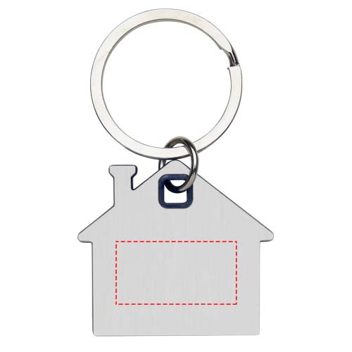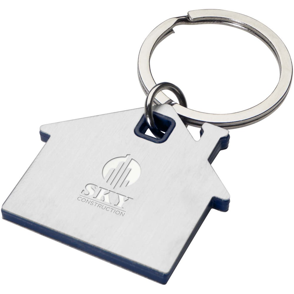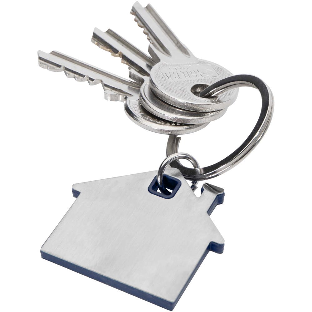 Schlüsselanhänger in Form eines Hauses mit einer Edelstahlplatte mit mattem Design auf der Vorder- und Rückseite und einem farbigen Kunststoffchip in der Mitte.