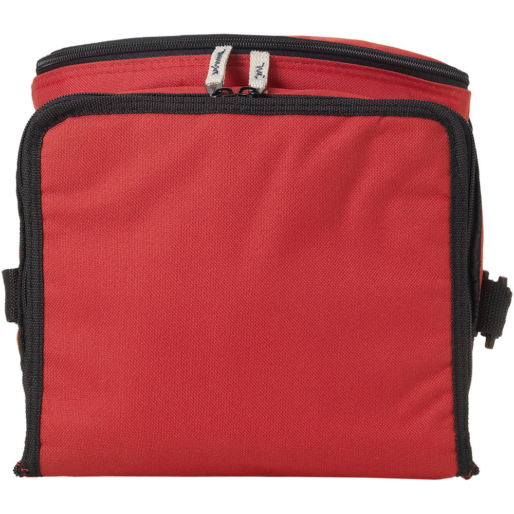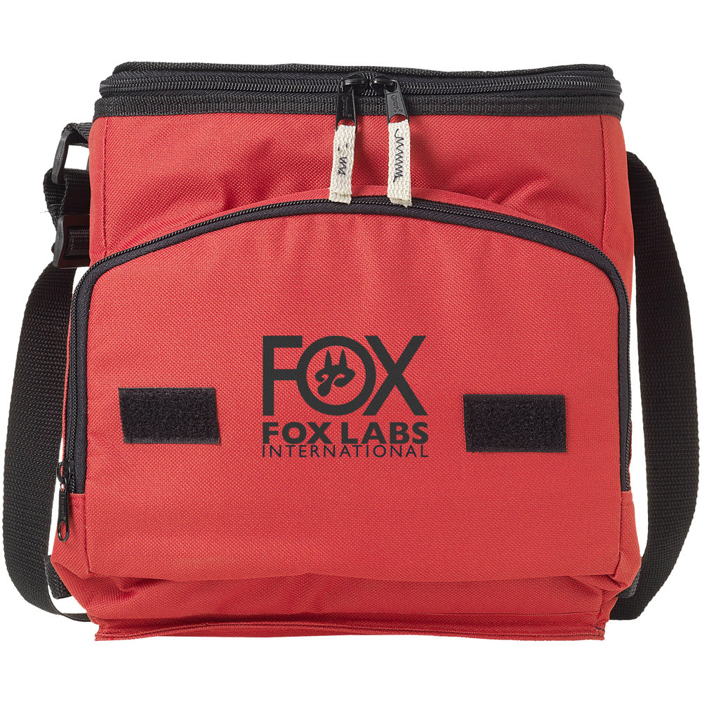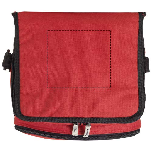 Zusammenfaltbare Kühltasche mit Hauptfach mit Reißverschluss und Fronttasche mit Reißverschluss. Verstellbarer Schulterriemen. Die Kühltasche kann dank des Klettverschlusses an der Fronttasche flach zusammengefaltet werden.