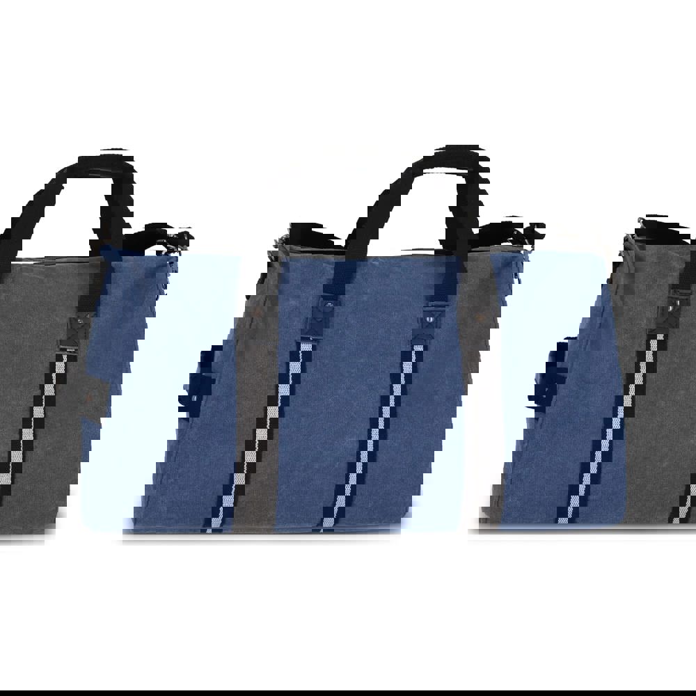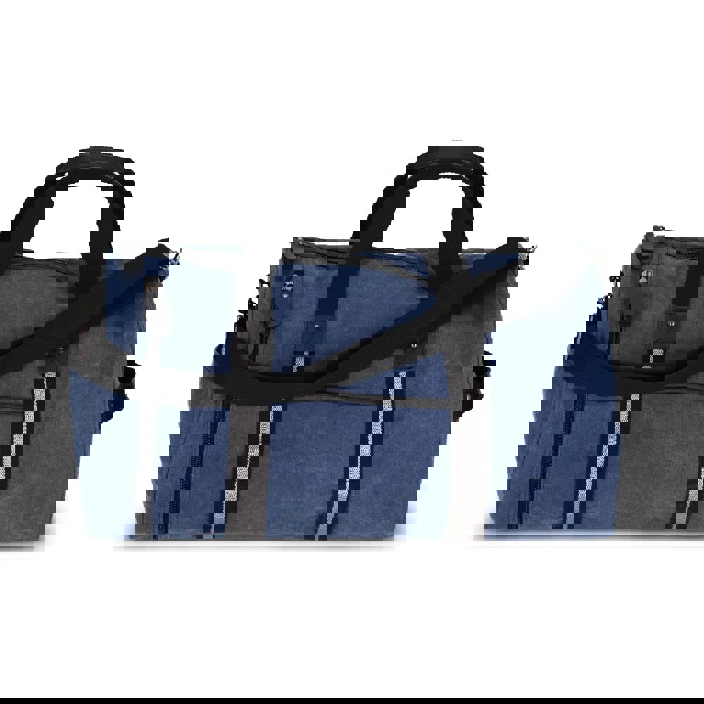 Elegante Reisetasche aus recyceltem Baumwoll-Canvas. Mit 100% recyceltem, reflektierendem Gurtband, luxuriösen Reißverschlüssen und Griffen sowie einem Futter aus 100% recyceltem Polyester. Mit seitlichen Tragegriffen, verstellbarem, abnehmbarem Schultergurt, 1 Seitentasche, 2 Vordertaschen und 3 Innentaschen, eine davon mit Reißverschluss.