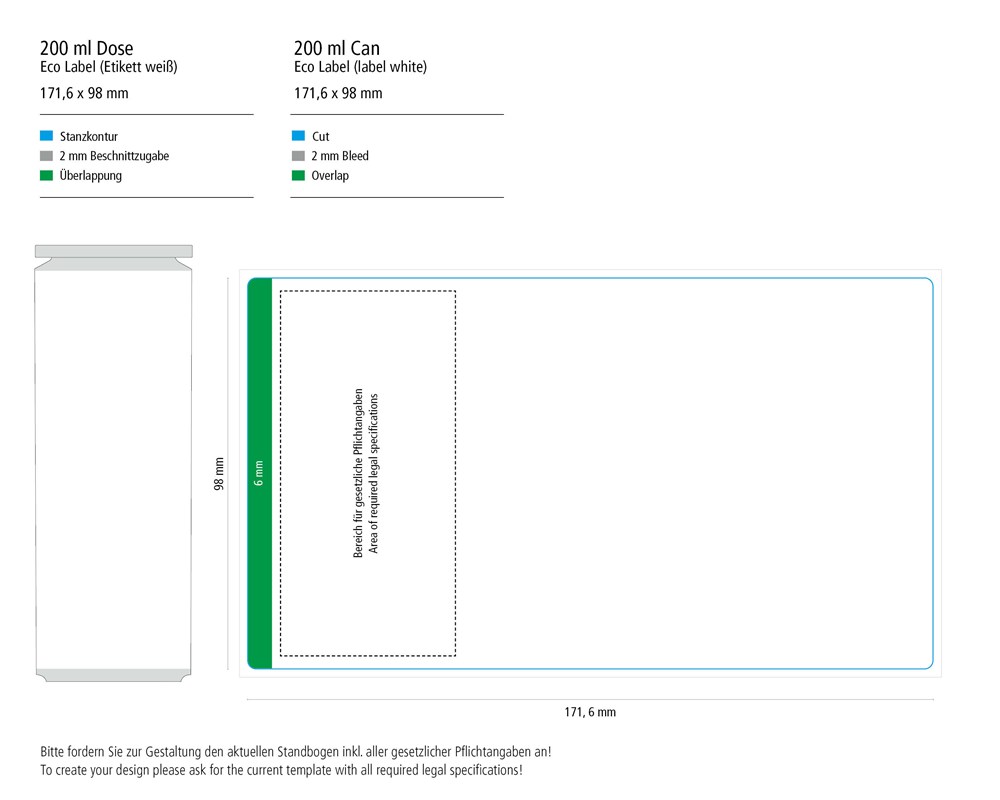 Eco Label: Etikettierung im geraden Bereich (rundum). Weißes, holzfreies, ungestrichenes Papieretikett, hergestellt zu 100% aus zertifizierten Recyclingfasern (PCR) mit offener und natürlicher Oberflächenstruktur. Matt-stumpf ohne Glanz für ein besonders natürliches Aussehen. Umweltfreundlich ohne Lack. Feuchtigkeitsfest.