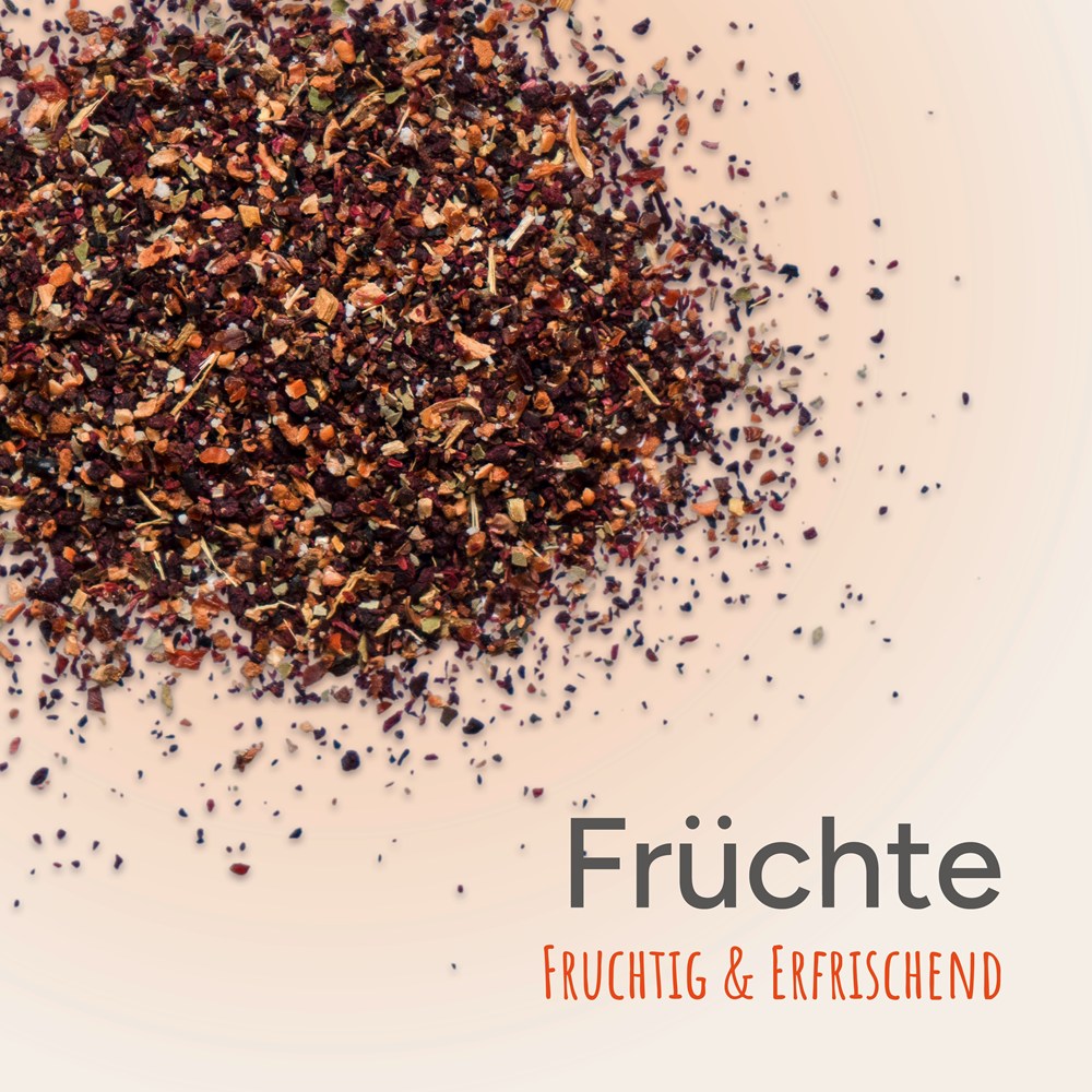Sorte: Früchte Tee. Eine herrlich fruchtige Mischung! Die Fruchtstücke, zum Teil aus Wildsammlung, Blätter und Gewürze enthalten kein Koffein und wenig Gerbstoffe. Ein besonders saftiger Durstlöscher für Jung und Alt - schmeckt heiß oder eisgekühlt.