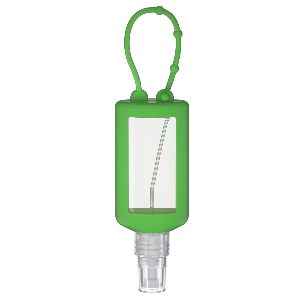 50 ml Flasche aus 100% recyceltem PET, transparent mit leichter R-PET-Färbung. Mit Pumpaufsatz "transparent" mit Schutzkappe; Silikonhülle und Schlaufe in grün. Nachfüllbar.