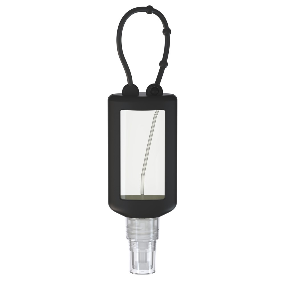 50 ml Flasche aus 100% recyceltem PET, transparent mit leichter R-PET-Färbung. Mit Pumpaufsatz "transparent" mit Schutzkappe; Silikonhülle und Schlaufe in schwarz. Nachfüllbar.