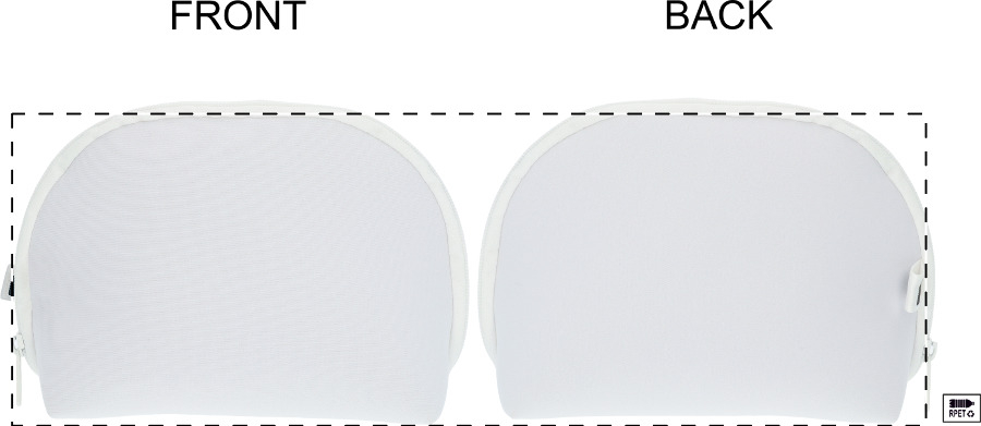 Individuelle Kosmetiktasche mit Reißverschluss aus RPET-Neopren mit vollflächigem Sublimationsdruck. Mit Label RPET. Mindestmenge: 50 Stk.