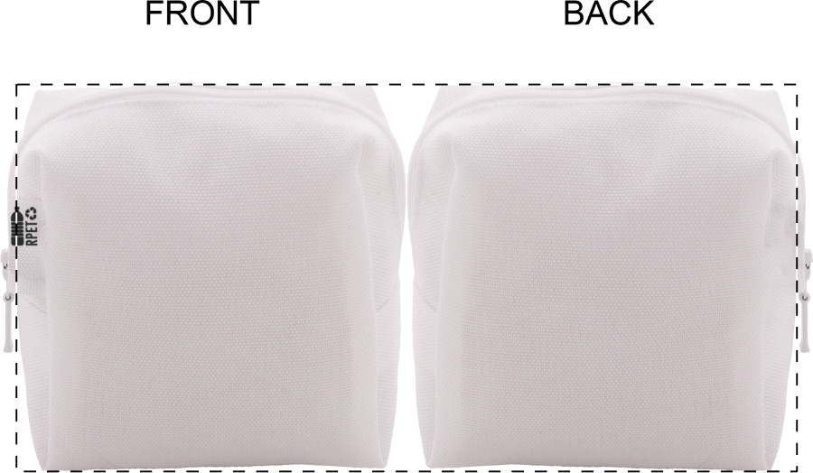 Individuelle, quadratische Reißverschluss-Kosmetiktasche aus 600D RPET Polyester mit vollflächigem Sublimationsdruck. Mindesmenge: 50 Stk.