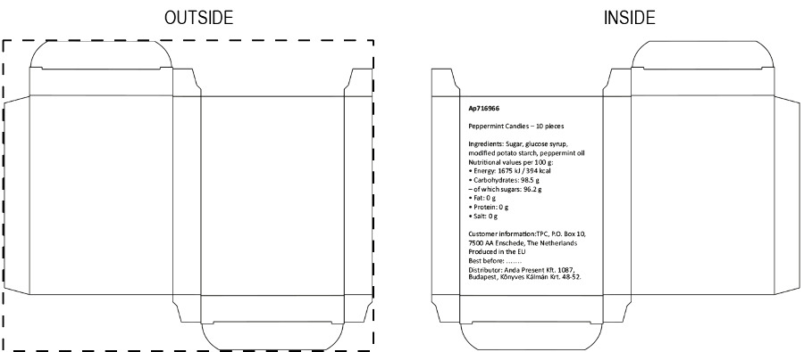 10 große Minzbonbons im Blister mit individuell gestalteter, vollfarbig bedruckter Papierschachtel. Mindestmenge: 100 Stk.