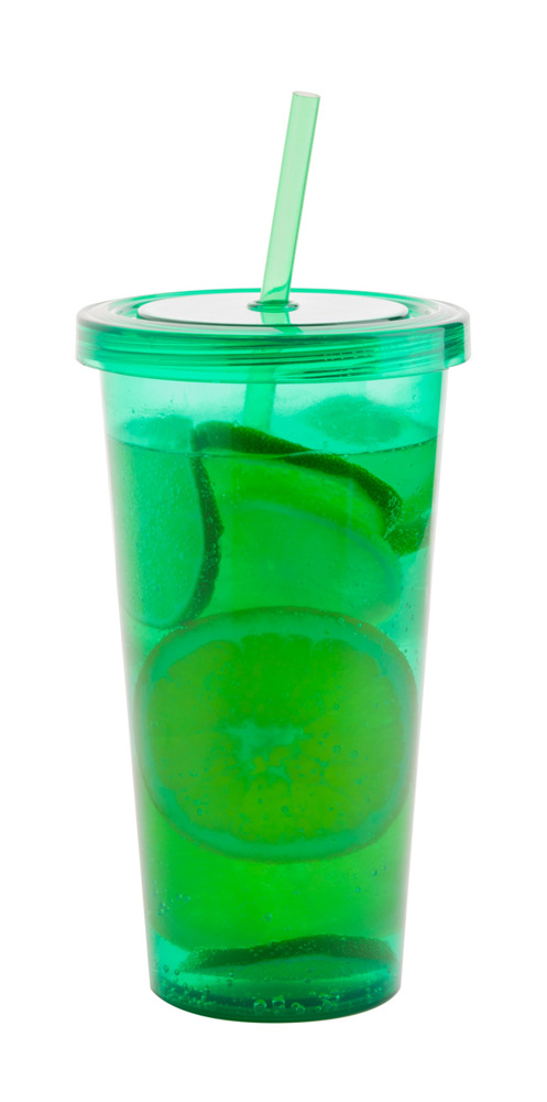 Farbig transparenter Trinkbecher aus Kunststoff mit Trinkhalm. Füllmenge: 750 ml.